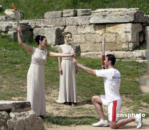 希臘當(dāng)?shù)貢r間3月24日,北京二00八年奧運會圣火采集儀式在古奧林匹亞競技場舉行,最高女祭司將橄欖枝傳遞給第一火炬手希臘運動員亞歷山大,并用古希臘語對他說:“將圣火傳遞給世界,告訴人們奧運會就要開始了。中新社發(fā) 王歡 攝