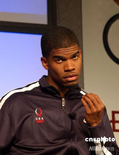 4月16日,美國110米欄名將特拉梅爾在芝加哥出席美國奧運代表隊新聞峰會時表示,去北京參加奧運會的目標仍是奪冠。中新社發 李靜 攝