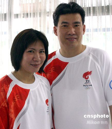 4月22日下午2時15分,雅加達特區省長法烏茲手持“祥云”火炬跑出第一棒,北京奧運圣火在雅加達的傳遞正式啟動。北京奧運圣火雅加達站傳遞從蘇加諾體育中心東門開始,八十名火炬手圍繞其中的蘇加諾體育場進行七公里左右的傳遞。八十位火炬手中,有印尼現役和退役優秀運動員、贊助商代表、政府官員、社會活動家等。圖為明星火炬手夫婦王蓮香(左)與魏仁芳在傳遞火炬前。中新社發 沈晨 攝