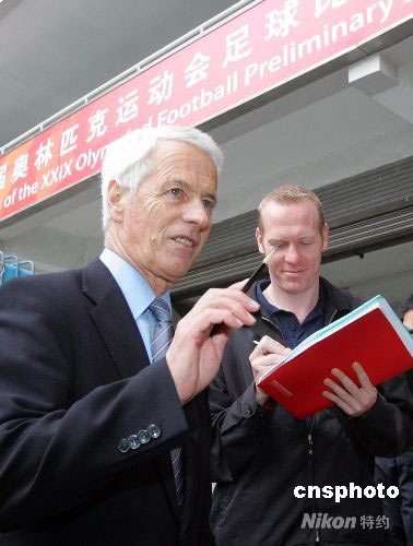 4月22日,國際足聯考察團一行在北京奧組委官員的陪同下抵達上海,對08奧運足球上海賽區籌備工作進行考察。圖為國際足聯競賽部官員瓦特·西伯(左)和約翰·舒馬赫在上?疾鞀W運足球賽場。中新社發 湯彥俊 攝