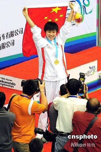 4月27日,中國選手郭耘菲獲得亞洲跆拳道女子67公斤級冠軍。在比賽中郭耘菲戰得辛苦,兩次摔倒接受治療,最終用堅強的毅力戰勝菲律賓選手,奪得冠軍。中新社發 高山岳 攝