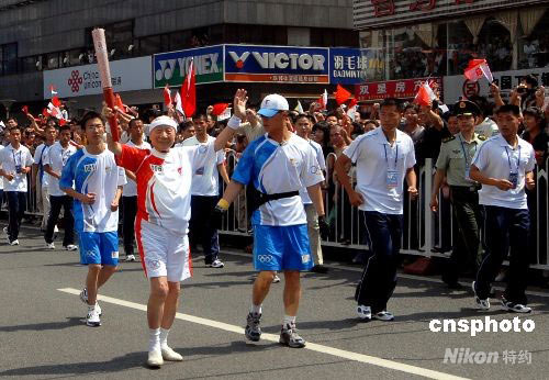 5月11日上午,福建年齡最大的火炬手,九十四歲香港籍的歐椿堃老先生正在傳遞北京奧運火炬。當日,北京奧運火炬福建站傳遞在福州來開帷幕。 中新社發 王東明 攝
