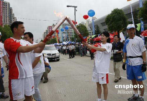 5月28日上午8時(shí),北京奧運(yùn)會(huì)火炬接力安徽的傳遞活動(dòng)在合肥拉開帷幕。合肥籍世界跳水冠軍李娜擔(dān)任第一棒火炬手。圖為李娜將圣火傳遞給抗震勇士合肥市特警支隊(duì)的火炬手周世軍。中新社發(fā) 張婭子 攝