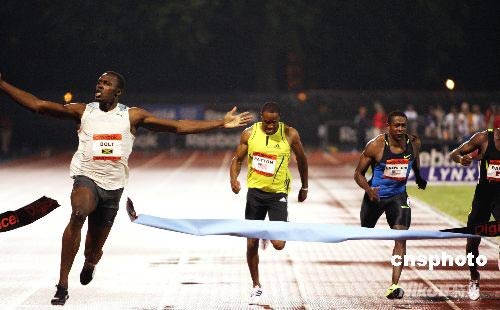 2008年5月31日晚,牙買加選手博爾特在美國紐約舉行的銳步田徑大獎賽以9秒72的成績打破了男子100米的世界紀錄。圖為博爾特(左一)在比賽中沖過終點的一瞬間。中新社發 鄧悅 攝