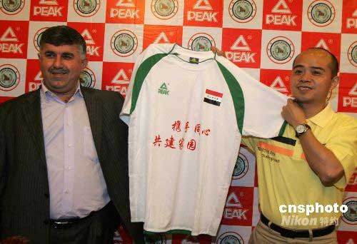 6月14日,2010南非世界杯亞洲區小組賽中國隊主場對陣伊拉克隊的比賽,北京時間20時在天津奧林匹克中心體育場打響。伊拉克隊球員將在比賽前的熱身中,著胸前印有“攜手同心,共建家園”字樣球衣, 聲援中國人民抗震救災。圖為伊拉克足協官員和球隊贊助商代表共同展示這款“愛心球衣”。中新社發 崔躍勇 攝