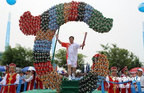 7月10日,奧運火炬在內蒙古赤峰市進行傳遞。火炬手于建設穿過用福娃組成的“玉龍”。在赤峰翁牛特旗出土的紅山文化標志性文物——玉龍,被史學界定為“中華第一龍”。中新社發(fā) 廖攀 攝