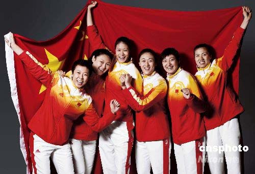 身著北京奧運(yùn)會領(lǐng)獎(jiǎng)服的中國女排姑娘與國旗激情合影。北京奧運(yùn)會中國代表團(tuán)領(lǐng)獎(jiǎng)服日前在北京披露,衛(wèi)冕冠軍中國女排的姑娘們試穿領(lǐng)獎(jiǎng)服,在五星紅旗下愈加風(fēng)采。中新社發(fā) 沈晨 攝