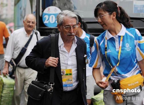 七月二十七日,青島奧運村舉行開村升旗儀式,各國帆船運動代表團的運動員紛紛入住青島奧運村,進入奧帆賽最后實戰準備階段。圖為中國志愿者在與外國帆船教練進行交流提供幫助。中新社發 曲連遵 攝