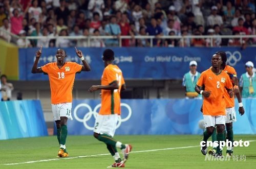 8月7日,北京奧運會上海足球分賽場男足預賽,作為首次參加奧運會足球比賽的科特迪瓦,在遭遇衛冕冠軍阿根廷隊時毫不示弱,球員門以精湛的球技,征服現場球迷贏得掌聲。圖為科特迪瓦18號球員塞古·西塞(CISSE Sekou)進球后歡慶。中新社發 湯彥俊 攝