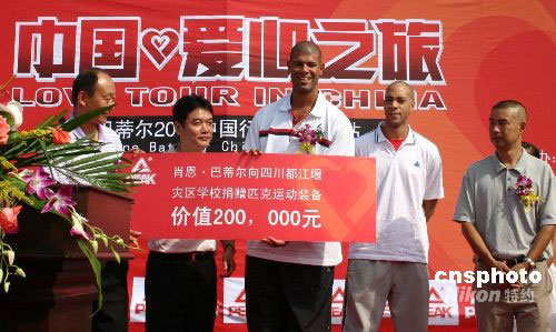 圖:NBA火箭隊球星巴蒂爾慰問四川災區民眾