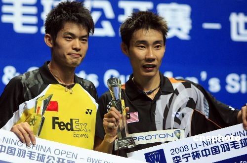 11月23日,在上海舉行的2008年中國羽毛球公開賽男子單打決賽中,中國頭號選手林丹(左)以2比0戰勝馬來西亞選手李宗偉(右),獲得冠軍。這也是他第三次奪得中國羽毛球公開賽的冠軍。中新社發 湯彥俊 攝