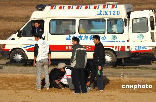11月30日,在湖北武漢市“東方馬城”舉行的2008年全國速度賽馬錦標賽上,2600米沙地無限定馬決賽第二組在比賽時,發生賽馬“追尾”驚險一幕。在跑到第二圈進入最后全力沖刺時,新疆隊唐旭駕馭的7號馬“巴黎之眼”避讓不及北京隊魏云忠駕馭的10號馬“賽速”,兩馬重重地撞在一起,“巴黎之眼”當場被撞暈倒地不醒,“賽速”右前蹄則被撞斷受傷嚴重,所幸兩名運動員均無大礙。據業內人士介紹,賽馬運動屬于高風險運動,運動員和馬匹在激烈的比賽過程中,都有出現意外的可能。中新社發 楚天行 攝