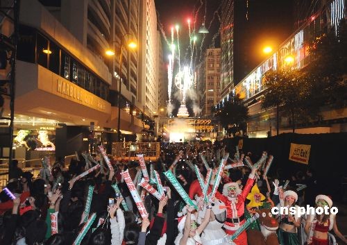 十二月二十四日晚(平安夜),逾十萬市民及游客齊聚香港尖沙咀鬧市,參加圣誕倒數街頭派對,圣誕老人、圣誕女郎及雪人在場助興,節日氣氛濃厚。中新社發 蔡蔓莉 攝