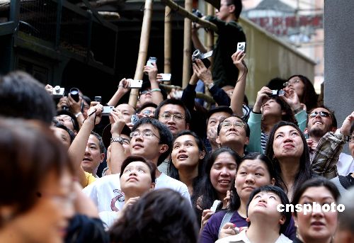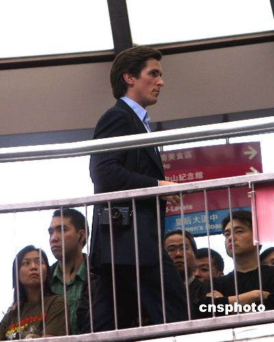 耗資十八億港元的美國好萊塢巨片《蝙蝠俠黑夜之神》十一月九日在香港中環電梯拍攝取景,男主角基斯頓比爾在拍攝中卸下太陽鏡露出真容,旁邊數百群眾演員配合演出,如人潮般的觀眾被阻隔在天橋下翹首觀看。該片一連七天在香港取景,除地面街景外,更每日派出兩架直升機在港島上空拍攝建筑及維港夜景風貌。中新社發 王麗南 攝