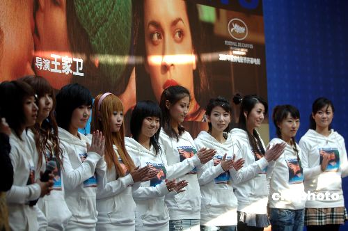 十一月二十一日,王家衛聯合女性交友網站愛情公寓在北京長城腳下公社舉辦新聞發布會,通過愛情公寓征選的十位藍莓女孩集體亮相,他們還將搭乘藍莓巴士進行為期一個月,走遍全國十個城市的旅程,女孩將會在愛情公寓網站中上傳每日旅行日記照片,最終由網友票選一位最具有藍莓精神的藍莓天使。片方希望通過這種形式宣傳,讓電影里的情節在生活中同樣可以實現,并讓這十位藍莓女孩也有機會體會諾拉瓊斯在電影里的感情旅程。中新社發 廖攀 攝