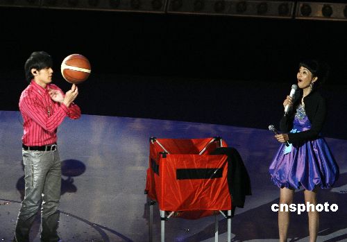 2008年1月21日,北京2008年奧運會歌曲宣傳推廣啟動晚會在北京奧林匹克籃球館舉行,歌手們傾情演出,用各自的歌聲為奧運造勢,周杰倫更是在現場進行灌籃表演。這是竣工后的北京奧林匹克籃球館首次舉辦大型活動。中新社發 魯谷 攝