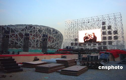 2月1日,施工人員正在國家體育場(“鳥巢”)和國家游泳中心(“水立方”)之間搭建“春節聯歡晚會”的演出設施。據悉,除夕夜奧運建設者們將可現場觀看到有關節目。 中新社發 玉龍 攝