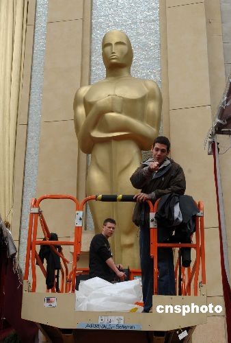 第八十屆奧斯卡金像獎2月24日晚將在好萊塢揭曉。當天中午柯達劇場門口最大一尊奧斯卡雕塑揭去雨衣,準備迎接頒獎盛典。中新社發 張煒 攝