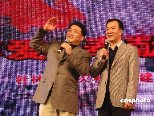 2月25日晚,中國著名相聲表演藝術(shù)家姜昆(左)、戴志誠(右)代表中國文聯(lián)、中國紅十字會慰問團(tuán)為桂林賑災(zāi)晚會表演相聲《樂在其外》。當(dāng)晚,馮鞏、牛群、鞠萍、劉蘭芳等明星也參加了此次賑災(zāi)晚會。中新社發(fā) 歐惠蘭 攝
