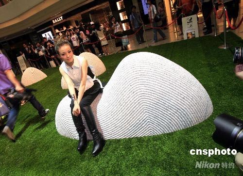 五月二十七日,臺灣藝術(shù)家洪東祿、黃致陽藝術(shù)展在香港時(shí)代廣場舉行,香港歌星容祖兒被邀出席并在藝術(shù)家黃致陽的“座千峰”雕塑前接受采訪。容祖兒介紹,明日就將與劉德華等數(shù)名藝人赴四川探訪地震災(zāi)民,給他們送去心靈的慰籍書藉。中新社發(fā) 王麗南 攝
