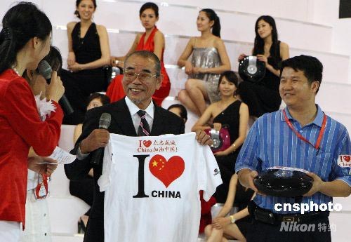 5月30日,在北京舉行的第17屆中國國際專業(yè)音響燈光樂器及技術(shù)展覽會上,卡拉OK之父井上大佑亮相雷石演出設備盛會現(xiàn)場,圖為在活動上井上大佑參加向中國四川地震災區(qū)賑災拍賣活動。中新社發(fā) 錢興強 攝