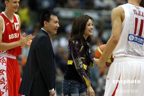 備戰北京奧運會的中國男籃,7月20日晚在杭州舉行的2008斯坦科維奇洲際杯籃球賽的最后一場比賽中以72比50戰勝由年輕選手組成的俄羅斯隊。香港歌星容祖兒作為本屆杯賽的形象大使到場主持開球儀式。中新社發 任晨鳴 攝