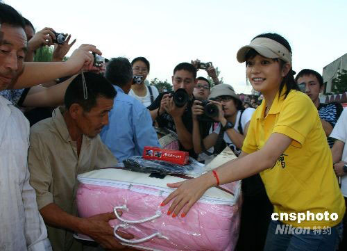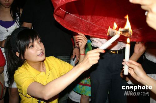 9月10日,由香港華光功德會組織的“情系四川——中秋月餅暖萬心慰問活動”在綿陽拉開序幕,當晚,影視明星趙薇在與災區學生歡聚的中秋晚會上,點燃孔明燈,為四川祈福。中新社發 霍潺 攝