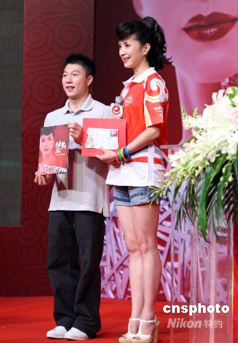 9月21日,素有“時(shí)尚民歌天后”之稱的青年歌手湯燦在北京推出為北京奧運(yùn)健兒量身定制的單曲《光榮與夢想》。奧運(yùn)體操冠軍李小鵬到場祝賀,并向湯燦贈送中國全體奧運(yùn)冠軍親筆簽名的奧運(yùn)首日封。中新社發(fā) 廖文靜 攝