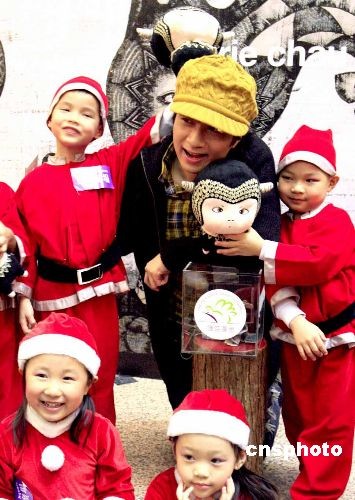 十二月一日,香港藝人古巨基與十位天真可愛的小小圣誕老人在時代廣場一起為護苗基金籌款。中新社發 張勤 攝