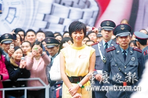 和郭富城上次來渝參加活動一樣,昨天下午,解放碑中心到郵局一段,被主辦方用鐵柵欄圍了起來,柵欄外的粉絲擠得水泄不通。不過老徐并沒有像某些明星一樣耍大牌,而是穿著一身無袖金色小禮服準時出現在現場,在10℃的低溫下赤膊上陣。粉絲們沒有上次郭天王來時聲嘶力竭的吶喊,倒是響起了各種評頭論足的聲音,大家最關注的是“徐靜蕾冷不冷”,當然也有一些大媽級的業余“粉絲”頗有些失望地表示,“完全是個小女孩兒嘛!”
