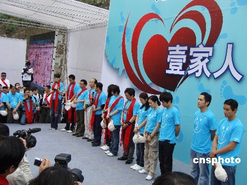 2009年5月10日,在“5·12”汶川大地震震中映秀鎮(zhèn),李連杰攜吳彥祖、林心如、鐘麗緹、柯以敏、鐘漢良、沈星、張杰等眾多明星義工,開展中國紅十字會(huì)壹基金主辦的“壹家人,壹起走”大型戶外援建災(zāi)區(qū)公益活動(dòng)。來自各地的300多名媒體記者、志愿者和明星們一同走完了2公里的災(zāi)區(qū)路。在半小時(shí)的路程中,完成了李連杰成立緊急救援聯(lián)盟等許多心愿,眾明星們的表現(xiàn)令人感動(dòng)。 壹基金是由國際巨星李連杰發(fā)起的立足于中國的國際性公益組織,分別在中國大陸及香港地區(qū)、美國和新加坡設(shè)立了辦事機(jī)構(gòu)。在中國大陸地區(qū),壹基金與中國紅十字總會(huì)合作,成立了“計(jì)劃”,致力于傳播公益文化,搭建公益平臺(tái),以推動(dòng)全國公益事業(yè)的發(fā)展。中新社發(fā) 善平 攝