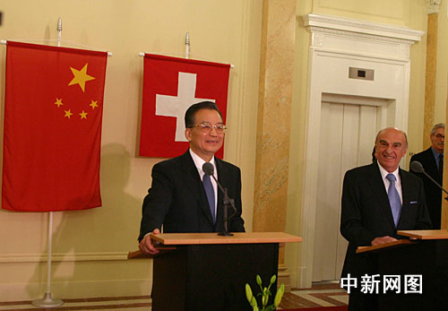 正在瑞士進行正式訪問的中國總理溫家寶,當地時間二十七日晚在伯爾尼與瑞士聯邦主席梅爾茨(右)舉行會談,并共同會見記者。雙方對會談成果給予積極評價。中新網記者 張朔 攝