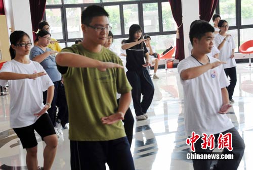 中新網7月5日電 7月5日,32名參加“2010年海峽兩岸青年聯歡節•中醫藥傳統文化研習營”的臺灣高校學子在福建中醫藥大學福州旗山校區學練24式太極拳。
