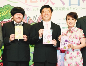 臺北市長郝龍斌(中)昨天在東京舉辦“花開了臺北”觀光旅游發表會,與翁倩玉(右)、小胖林育群(左)一同宣傳花博。(臺灣《聯合報》圖)