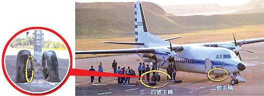 2009/11/01 FK-5003執行馬英九座機任務,在臺中清泉崗基地落地后滑行,右主輪煞車盤過熱,導致來令片及輪胎損傷熱熔并冒煙起火。
