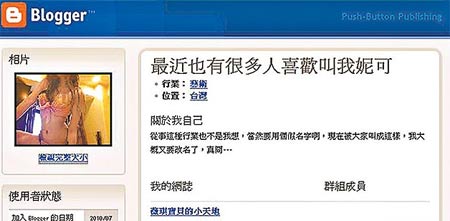 昨天更有出現(xiàn)冒稱應召女“妮可”的部落格《薇琪寶貝的小天地》,發(fā)文時間緊扣《壹周刊》報道陳致中召妓疑云的時間點,如7月3日指“接了個名人客人”、22日“被《壹周刊》拍”等。