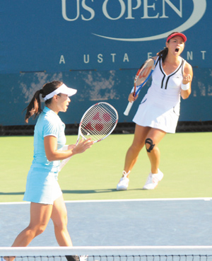 中新網9月9日電 臺灣《聯合報》今日報道說,“潔然配”的大陸鄭潔及臺灣詹詠然,昨天勇闖美國網球公開賽女雙四強,追平兩岸女雙組合在大滿貫賽最佳成績,繼續向前挺進。