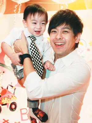 中新網9月17日電 據臺灣《聯合報》報道,臺灣藝人林志穎寶貝兒子Kimi16日慶周歲,林志穎為他高調慶生,不但親自布置場地當起主持人,并請來30多位包括名模王麗雅夫妻檔、鐘漢良等親朋好友見證兒子“抓周”儀式!靶⌒≈尽币埠軤帤,第一次抓了小型筆記本電腦后,馬上又握住方向盤與麥克風,儼然是林志穎接班人。