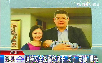 中新網9月25日電 據臺灣TVBS電視臺報道,連戰長子連勝文和兒媳蔡依珊為保護孩子,堅持不讓連定捷、連安捷兩個孩子輕易曝光,不過最近上千名國民黨代表,都收到一份別致的小禮物--蔡依珊、連勝文抱著連安捷一起拍合照制作成上千張悠游卡,連安捷可愛的的模樣也首度曝光。