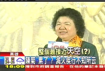 報(bào)道稱,盡管被批得滿頭包,陳菊還是照跑行程,29日下午和高雄縣長(zhǎng)楊秋興同臺(tái)時(shí),不但顯露疲態(tài),還有點(diǎn)語無倫次。道歉、勘災(zāi)、還得跑行程,陳菊只能用焦頭爛額來形容。