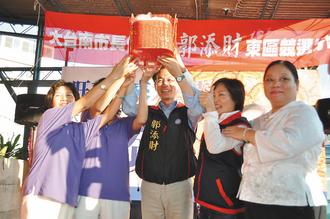 報道說,郭添財與妻子連久慧接受支持者送上的包子、粽子、鳳梨和蘿卜,象征“包中”、“好采頭”。他授戰旗給后援會,鼓勵大家在選戰最后46天當他的替身,全力沖刺。