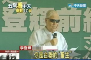 中新網10月12日電 據臺灣“今日新聞網”報道,“你是臺聯(‘臺聯黨’)的‘畜生’!”李登輝11日在替民進黨新北市長參選人蔡英文站臺時出現口誤。或許是真的年紀大了,李登輝這次替蔡英文助陣,不但講到激動處時,手抖個不停,還口誤連連,讓坐在一旁的蔡英文只能尷尬地笑。