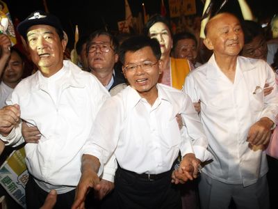 無黨籍高雄市長參選人楊秋興(中)17日與親民黨主席宋楚瑜(前左)、“總統府”資政林淵源(前右)一同出席競選總部晚會。圖片來源:“中央社”