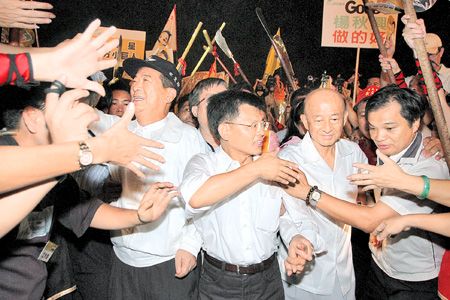 楊秋興高雄市競選總部17日晚間舉行成立大會,在宋江陣前導下,楊秋興(前中)牽著宋楚瑜(前左)及高縣白派大老林淵源(前右二)的手,從人群中走上舞臺。