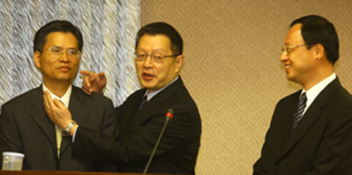 臺灣“立法院內政委員會”6日邀請內政部長江宜樺(右)專題報告“1126槍擊案”,會中“警政署長”王卓鈞(中)說明國民黨榮譽主席連戰的兒子連勝文中槍經過。圖片來源:臺灣“中央社”