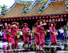 雖然下著大雨,但客家鄉親熱情依舊,個個打上客家花布領巾,組成客家味十足的踩街隊伍,由縣長領軍,從冬山鄉街道開始踩街至大興振安宮。