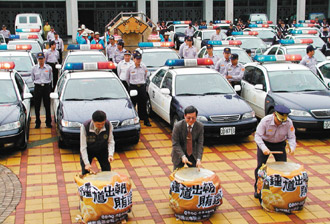 中新網11月28日電 據臺灣《聯合報》報道,為了宣示查賄的決心,屏東縣調查站主任、屏東“地檢署”檢察長、屏東縣警察局副局長27日在縣立棒球場前擊打寫有“鐘馗出朝,賄選難逃”的大鼓,宣示“鐘馗抓賄車隊”啟動。 (陳昆福 攝)