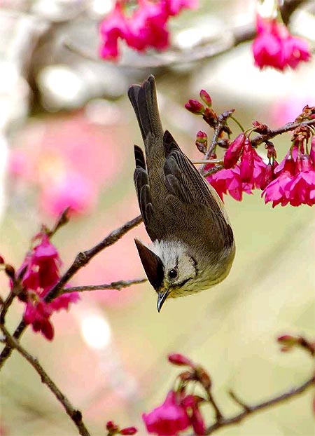 中新網(wǎng)1月2日電 據(jù)臺灣《中國時報》報道,冬季降遷的冠羽畫眉喜歡在盛開櫻花間覓食。圖為在臺灣省南投縣仁愛鄉(xiāng)正巧補捉到一只冠羽畫眉覓食的情況,搭配紅色的背景,像是洋溢著喜氣的年畫。(沈揮勝)