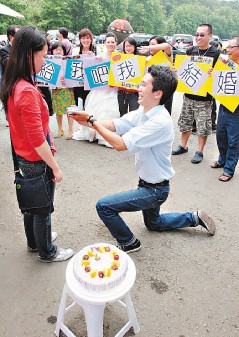 據(jù)臺灣《聯(lián)合報》報道,60對新人昨天齊聚蔣介石銅像園區(qū)參加“穿越時空遇到愛”集體結婚典禮。新人們牽手步過鵲橋進入會場,個個拼創(chuàng)意,有舉牌助婚團,還有頂著爆炸頭的新郎倌,連穿自由車車裝新人都搶著亮相,讓園區(qū)里頭喜氣洋洋。