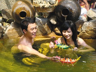 昨天推出的“雄黃酒湯”,在溫泉里加入適量的雄黃酒。據(jù)介紹,雄黃酒含有三硫化砷,不可多喝,但用來泡澡凈身,可以消除疫病,溫泉池畔放了一壺雄黃酒,游客還可以沿襲傳統(tǒng),用手指或毛筆沾酒,在額頭寫一個“王”字,體驗古代人驅邪的儀式。